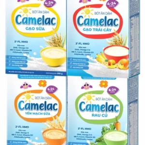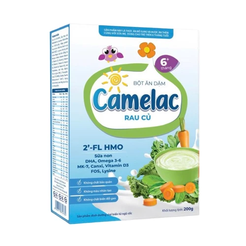 • Bột ăn dặm Camelac rau củ: Là bữa ăn dặm hoàn chỉnh, tiện lợi, dùng ngay sau khi pha chế mà không cần thêm sữa hoặc các gia vị bổ sung. Đảm bảo đầy đủ và cân đối các dưỡng chất cần thiết cho trẻ phát triển khoẻ mạnh.