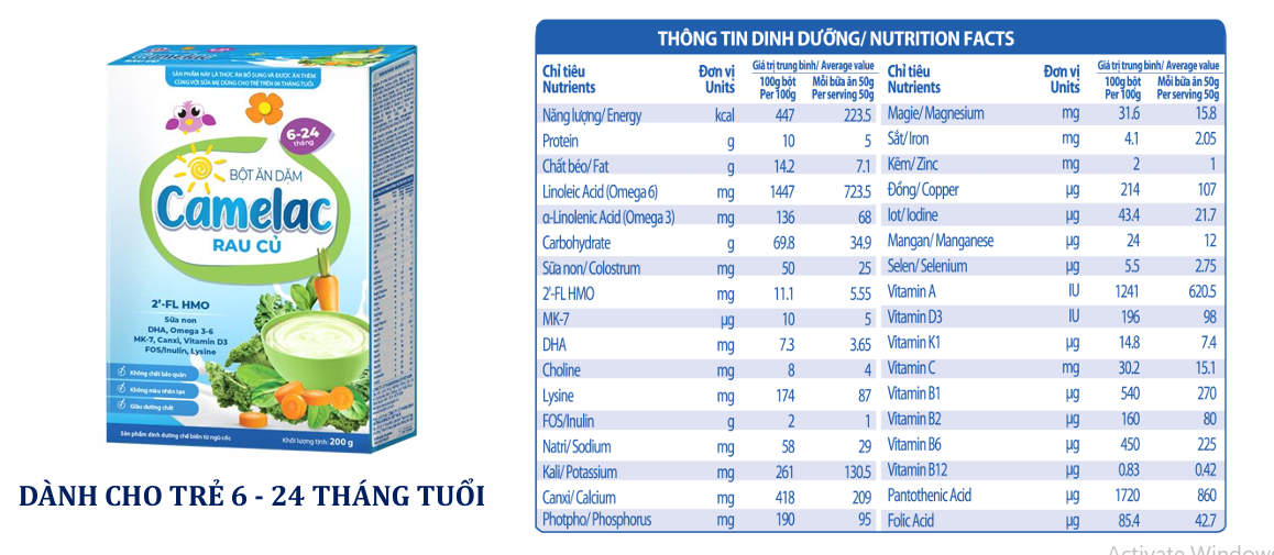 • 100g Bột ăn dặm Camelac rau củ cung cấp khoảng 447Kcal, 10g Protein, phù hợp theo quy chuẩn kỹ thuật về sản phẩm dinh dưỡng chế biến từ ngũ cốc cho trẻ từ 6-36 tháng tuổi.