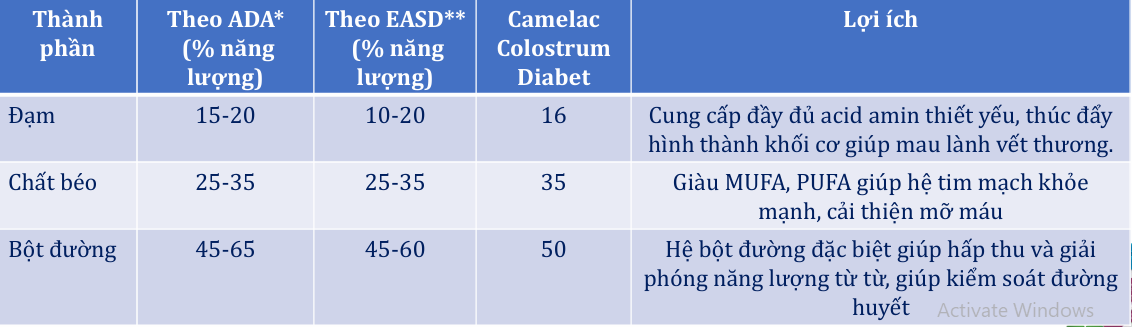 Camelac Colostrum Diabet cung cấp dinh dưỡng cân đối, khoa học: