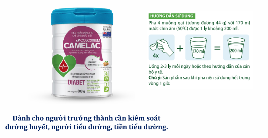 • Một ngày uống 3 ly Camelac Colostrum Diabet giúp bổ sung nguồn dinh dưỡng khoa học giúp bồi bổ, tăng cường thể lực cho người tiểu đường, tiều tiểu đường.